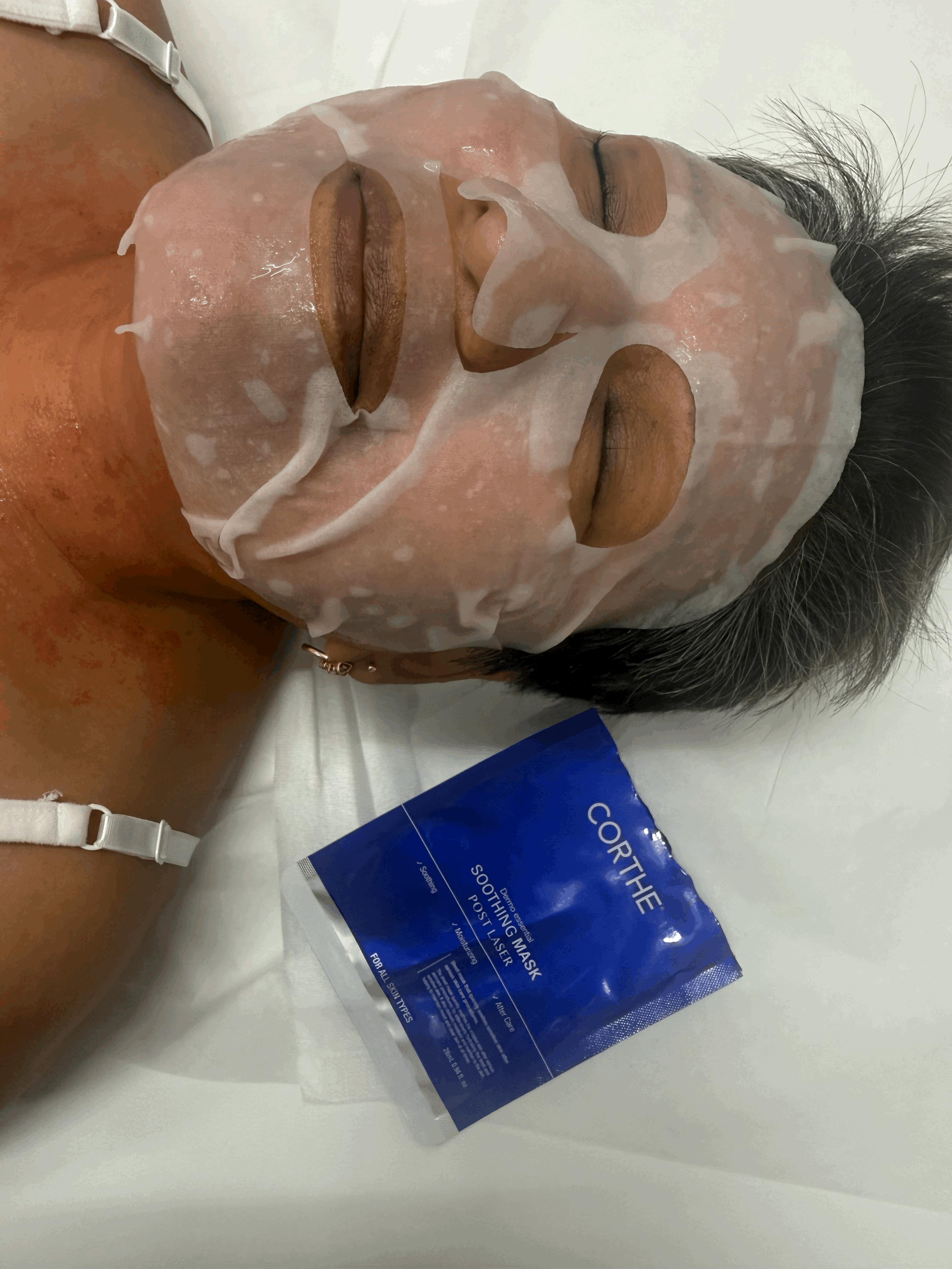 Corthe Soothing Sheet Mask is indicated for use following laser treatments as it quickly and effectively relieves heat and cools the skin – but it’s not just for post treatment. We recommend using this mask whenever a client needs a little extra TLC, such as when skin is irritated or inflamed, sunburned, or when a soothing restorative treatment is indicated.